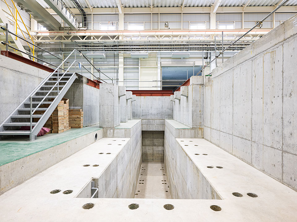 施工ポイント:内部は特殊な機械を使用するため、床面よりもかなり深く複雑な構造の機械基礎を施工しております。